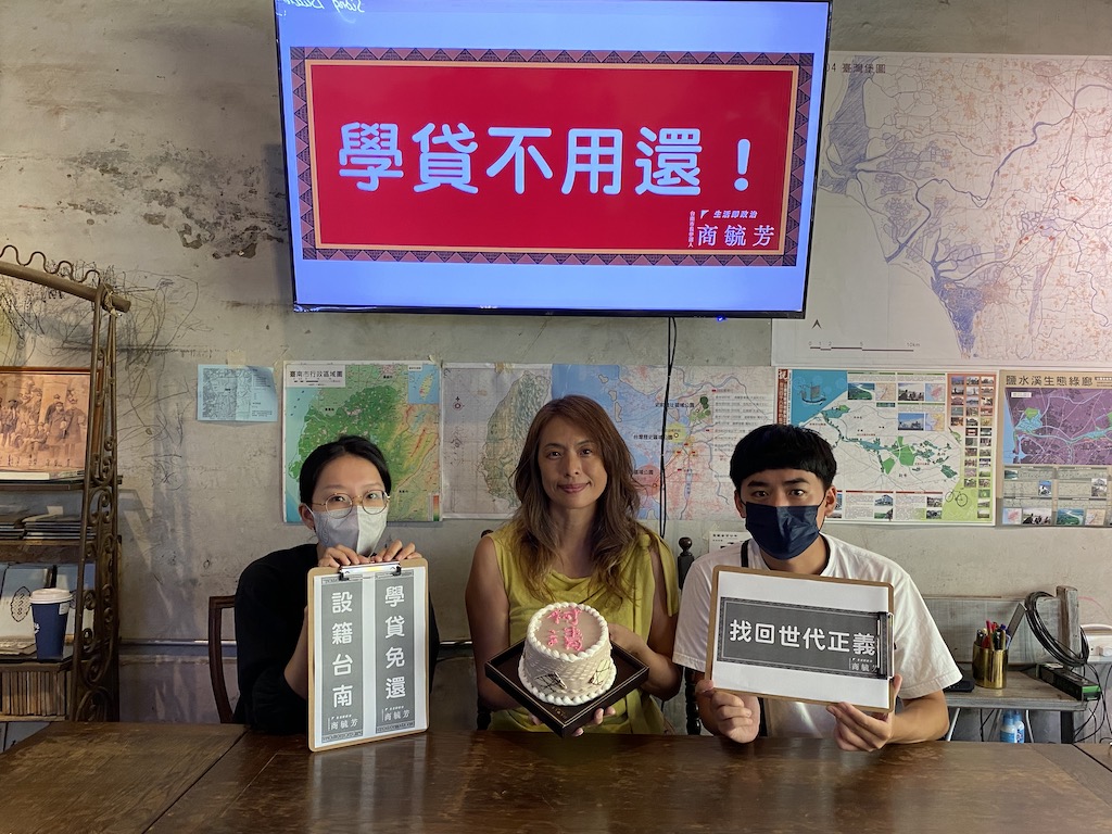 ▲無黨籍台南市長參選人商毓芳(中)強調,學貸免還不是譁眾取寵的選舉口號。