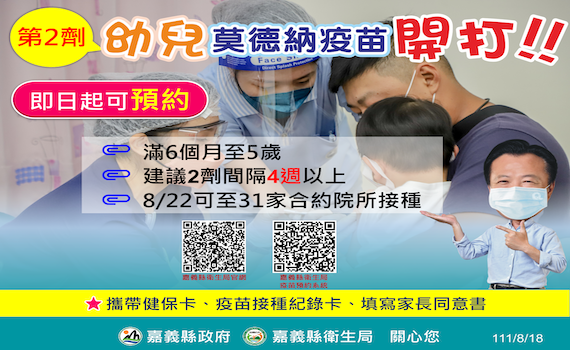 翁章梁縣長表示,6個月至5歲幼兒莫德納,自7月21日開打至今,嘉義縣已完成2,167人,第1劑與第2劑需間隔4-8週,為提供家長方便查詢接種資訊及提早預約,民眾可至嘉義縣疫苗預約系統預約,完整接種2劑才能提供完整保護力,相關接種資訊公布衛生局網站。
