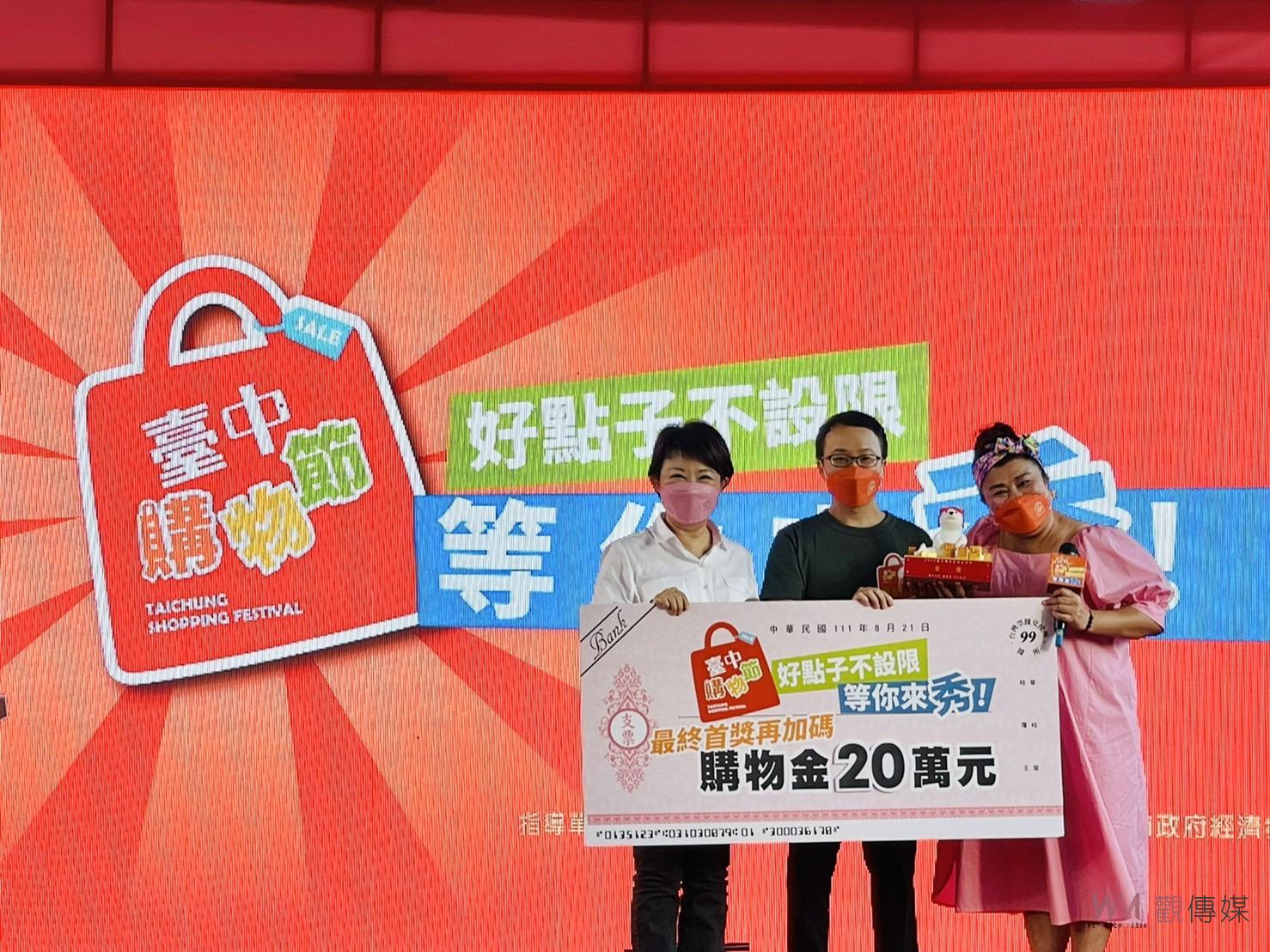▲「台中購物節等你來秀」創意提案冠軍由吳昱霆獲得,市長盧秀燕和台中購物節代言人林美秀頒獎。