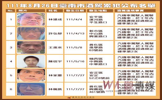 (台南新聞)【記者陳聖璋/台南報導】台南市今(26)日公布第7波酒(毒)駕累犯名單,本次公布6名累犯違規人,累計公布27人。本次公布違規地點分別為安平區1名、新市區1名、善化區2名、楠西區1名、安定區1名,交通局依法公布姓名、照片及違法事實等資訊。