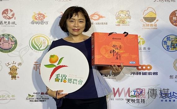 1日番路鄉農會總幹事趙幸芳於長榮文苑酒店舉辦的2022嘉義優鮮產品發佈會上走紅毯,展示該農會入選的優質農特產品,縣長翁章梁也大力推薦其中入選的專利冰淇淋。