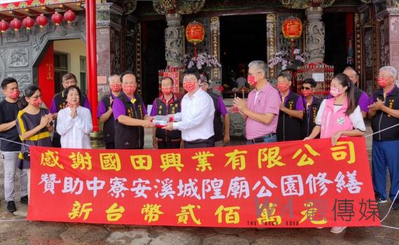 國田精品氣密窗一期廠區已經完工,目前進行生產出貨正常營運。負責人白家睿3日與城隍廟主委張正耀暨全體委員共同感謝中寮安溪城隍爺的神恩,國田興業公司特地捐贈二百萬元回饋城隍廟,以造福鹿草鄉及嘉義縣。