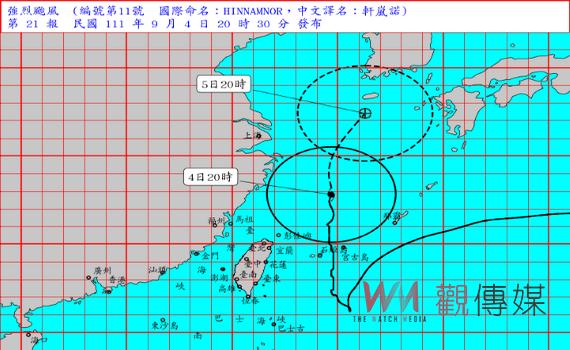 氣象局預測,軒嵐諾明晚8時的中心位置,在北緯 32.4 度,東經 126.3 度,即台北的北北東方約 940 公里的海面上。(照片由氣象局提供)