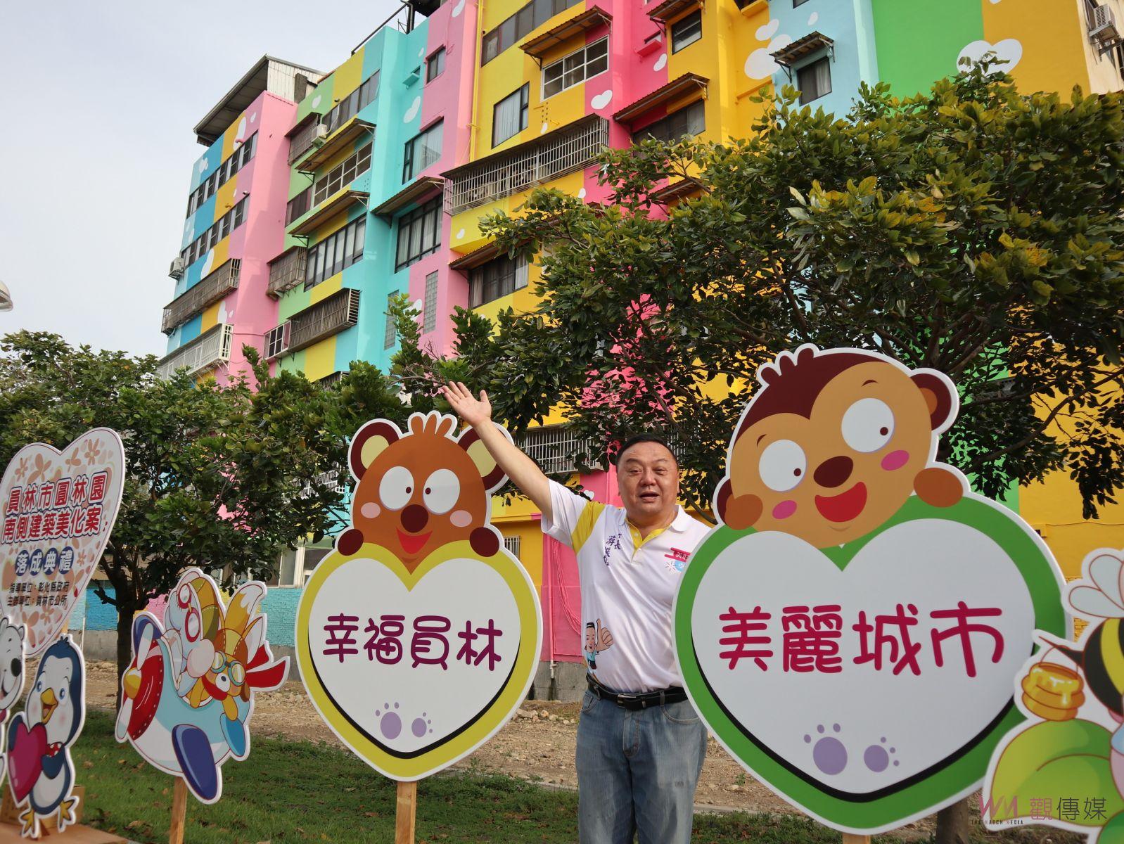 林田富說,圓林園是市民休憩運動的地方,原有南側舊有建物讓整體環境稍顯不足情況下,在考量整體美觀,由在地里長協助取得住戶同意並經縣府補助後進行彩繪工程,今天在現場看到完工的牆面搭配公園景觀,讓員林整個亮起來。
