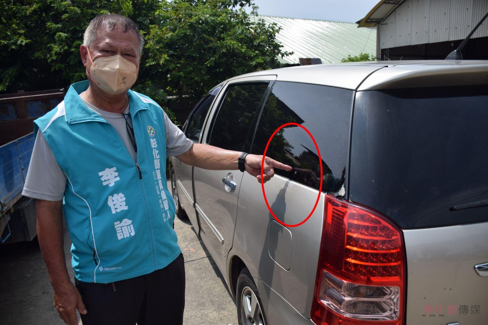 ▲彰化縣溪州鄉長參選人楊金源住所被開「黑槍」,警方調查,BB彈射擊參選人侄子的車子,車子出現7處彈孔。