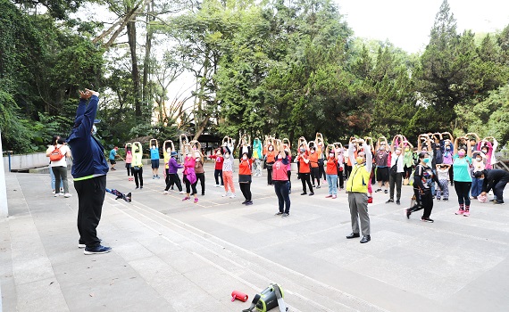 ▲廖志城鎮長和民眾一同爬上虎頭山臺灣地理中心碑前快樂作晨操。