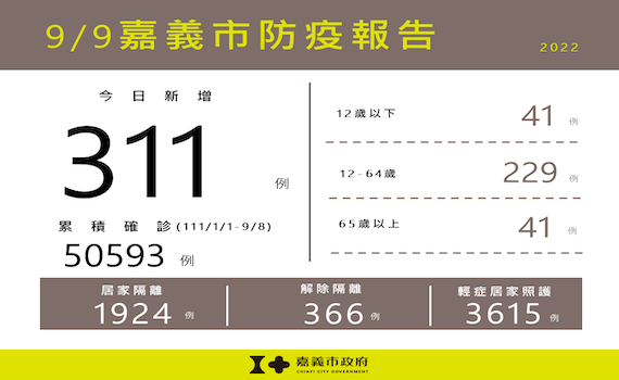(嘉義新聞)【記者 惲 朋 /嘉義報導】嘉義市9日公佈新增311例確診,其中12歲以下41例,12-64歲229例,65歲以上41例。目前全市居隔1924人,解隔366人,輕症居家照護人數3615人。市府:111/1/1截至111/9/8嘉義市累計確診嚴重特殊傳染性肺炎本土病例數為50593人。截至9/8本市接種5至未滿12歲兒童接種率:16,373人(93.90% )。請大家完整接種疫苗,務必要勤洗手、戴口罩,與不特定人士保持社交距離,保護自己也保護他人。