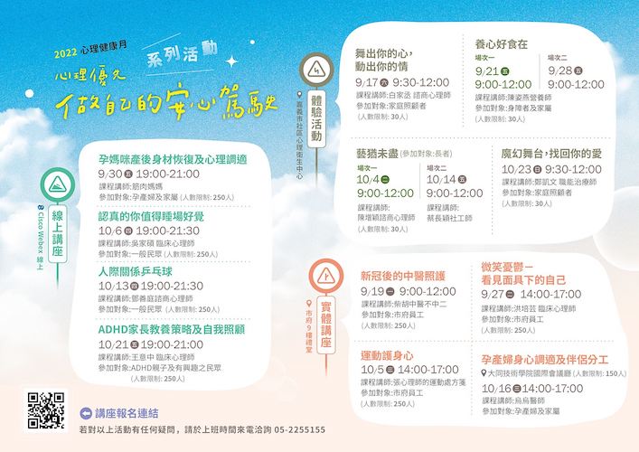 市府指出,講座內容也與大家分享新冠後的中醫照護、睡場好覺、微笑憂鬱、優質溝通、運動瑜珈、趣味料理、藝術體驗等適合長者、照顧者、孕產婦、身心障礙者及一般民眾的多元內容,活動即日起開始報名,相關資訊公告於嘉義市社區心理衛生中心粉絲專頁:https://www.facebook.com/warmheartpig/ ,歡迎市民朋友踴躍報名。社區心理衛生中心提供免費心理諮商,只要有需求的市民皆可電話預約(預約電話:05-2255155)。