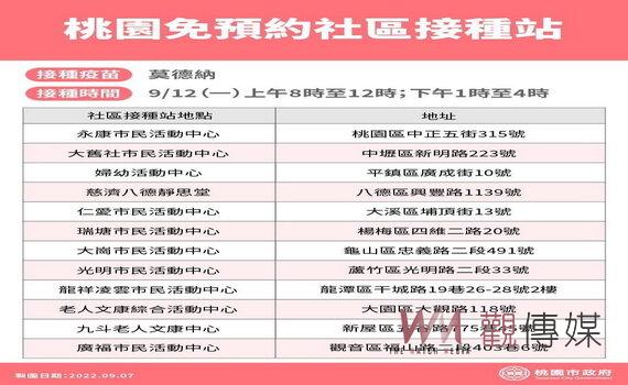 王文彥表示,明(12)日桃園12處社區接種站提供莫德納疫苗接種服務,時間為上午8時至12時及下午1時至4時,特別提醒民眾中央疫情指揮中心已將第二次追加劑間隔由5個月縮短成3個月,民眾年滿6歲以上不論劑次,只要符合接種資格者,皆可攜帶健保卡、疫苗接種紀錄卡(小黃卡)就近前往接種。