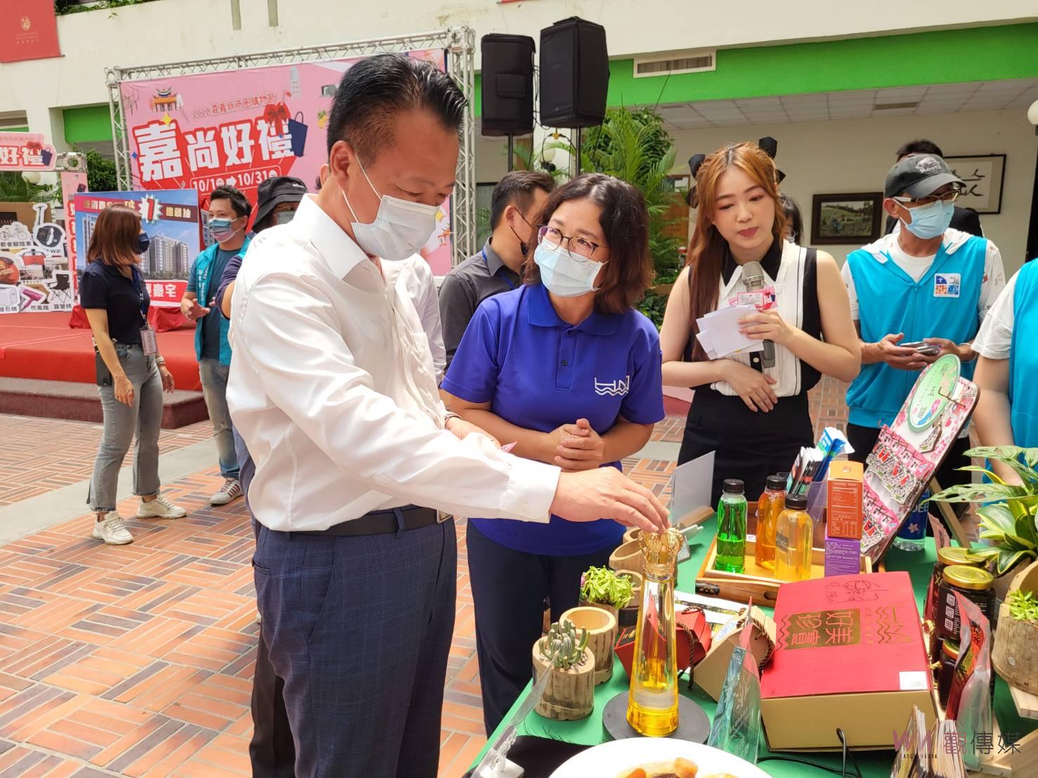 ▲縣長翁章梁逛起各商圈帶來的各式美食、伴手禮等,並鼓勵商圈幹部,可多利用自媒體行銷商圈並結合嘉義縣商圈購物節,另規劃各自商圈促銷活動,吸引消費及觀光人潮。