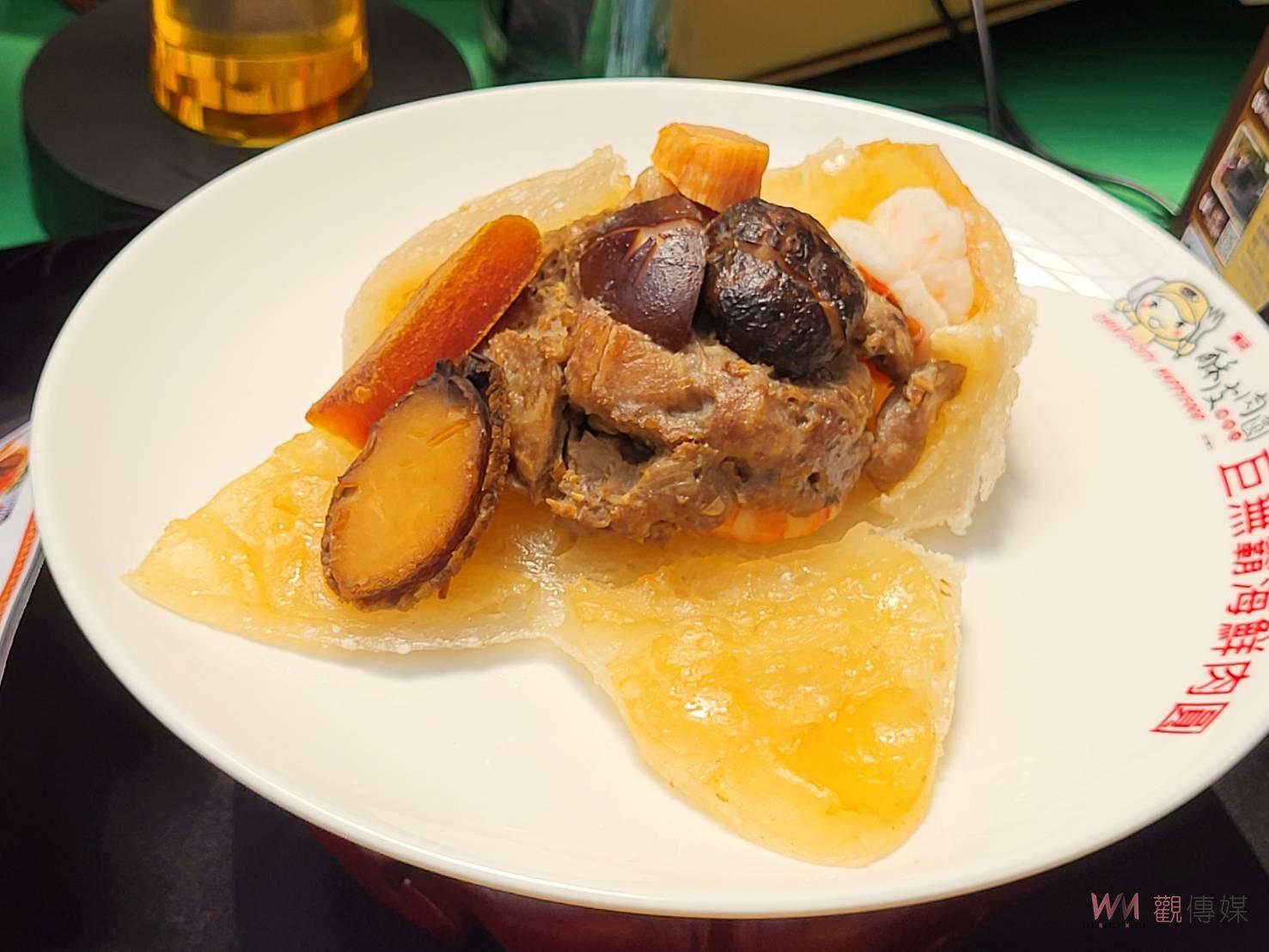 ▲布袋黑皮酥皮肉圓店於嘉義縣商圈購物節期間,推出巨無霸佛跳牆肉圓,10種餡料裡,神農烏魚子、產銷履歷白蝦、鮑魚、干貝都吃得到,1顆要價500元,為目前全國最大、最頂級量產化肉圓。