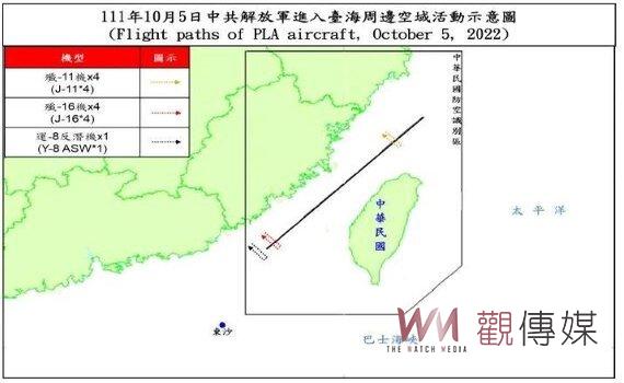 地方新聞新聞 國軍偵獲共機33架次共艦4艘次 在台灣周邊海空域活動 由 觀傳媒 提供 - 2022 年 10 月 5 日 上午 9:20 FacebookTwitterWhatsAppLINECopy URL (台北新聞)【記者潘明賜/台北報導】國防部今(5)日表示,迄下午5時止,偵獲共機33架次(逾越海峽中線及其延伸線進入西南空域9架次)、共艦4艘次,持續於台灣周邊海空域活動。 國防部說,國軍運用任務機、艦及岸置飛彈系統嚴密監控與應處。(圖片由國防部提供)