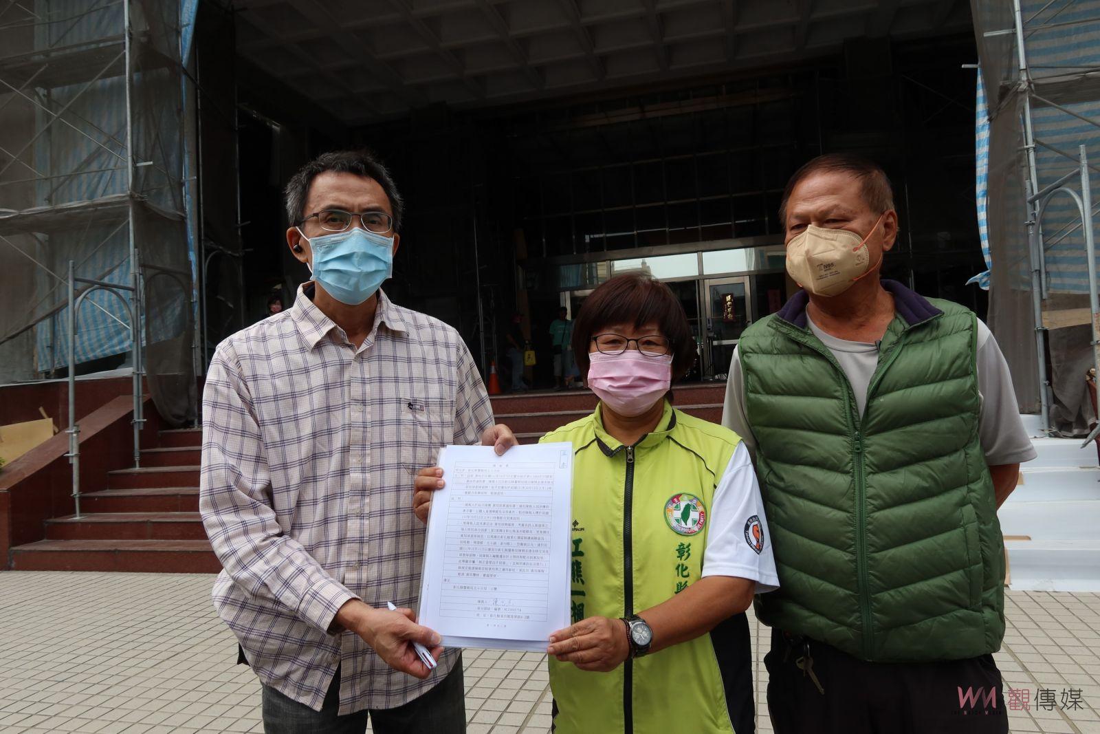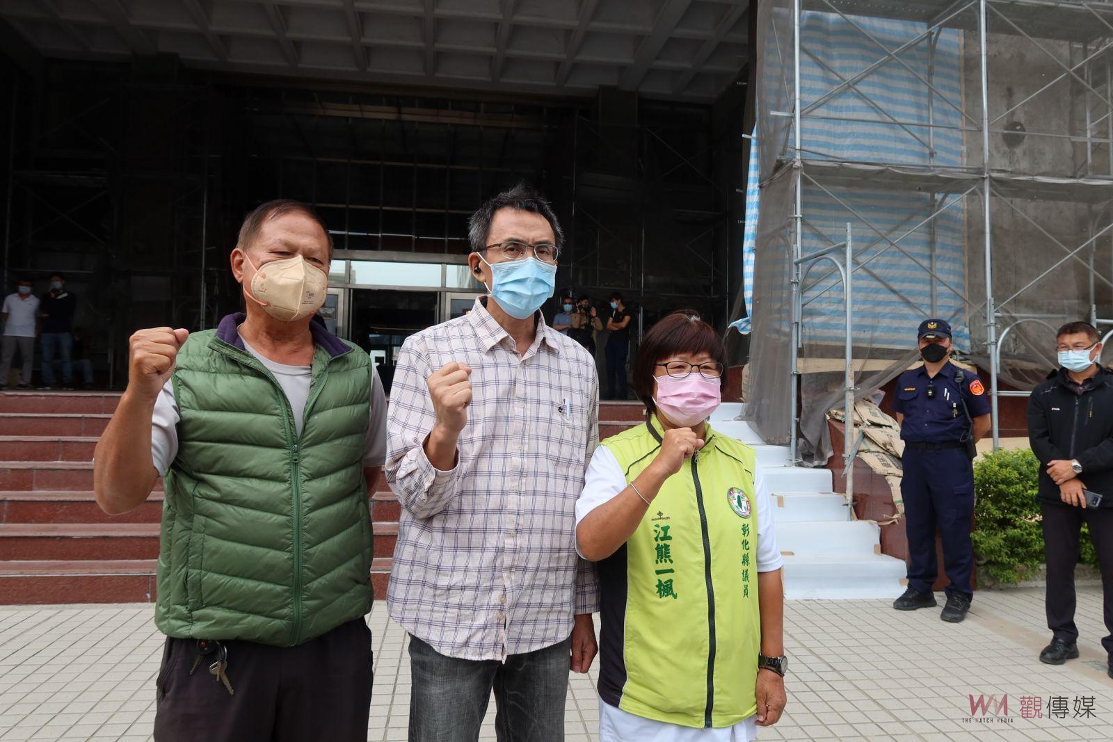 ▲溪州鄉農民陳忠杰遭彰化縣議員黃盛祿提告在縣議員候選人江熊一楓及前縣議員李俊諭等人在律師陪同到縣警局陳情。