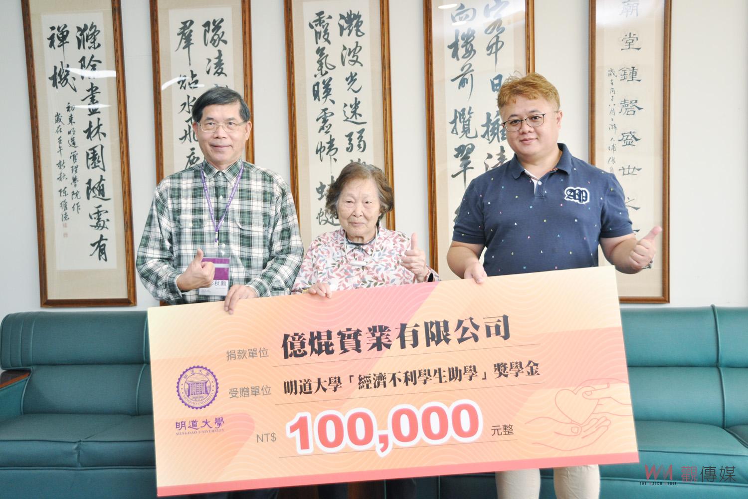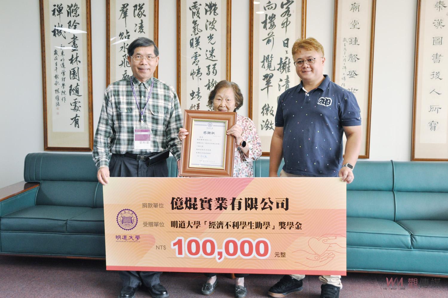 本次餐旅系碩士班學生陳伯豪及呂雪湞夫妻,經由林美惠學務長對於明道大學在經濟不利學生發展獎勵暨輔導機制的助學措施的說明,都非常贊同且支持,認同學校照顧學生的機制,這對於幫助弱勢學生的效益非常大,因此決定以億焜實業有限公司的名義,捐贈新台幣10萬元,鼓勵與支持同學不要受經濟或生活遇到困境的影響,而中斷學習,並鼓勵同學,相信只要努力學習、增能,就能夠獲得更好的成就。