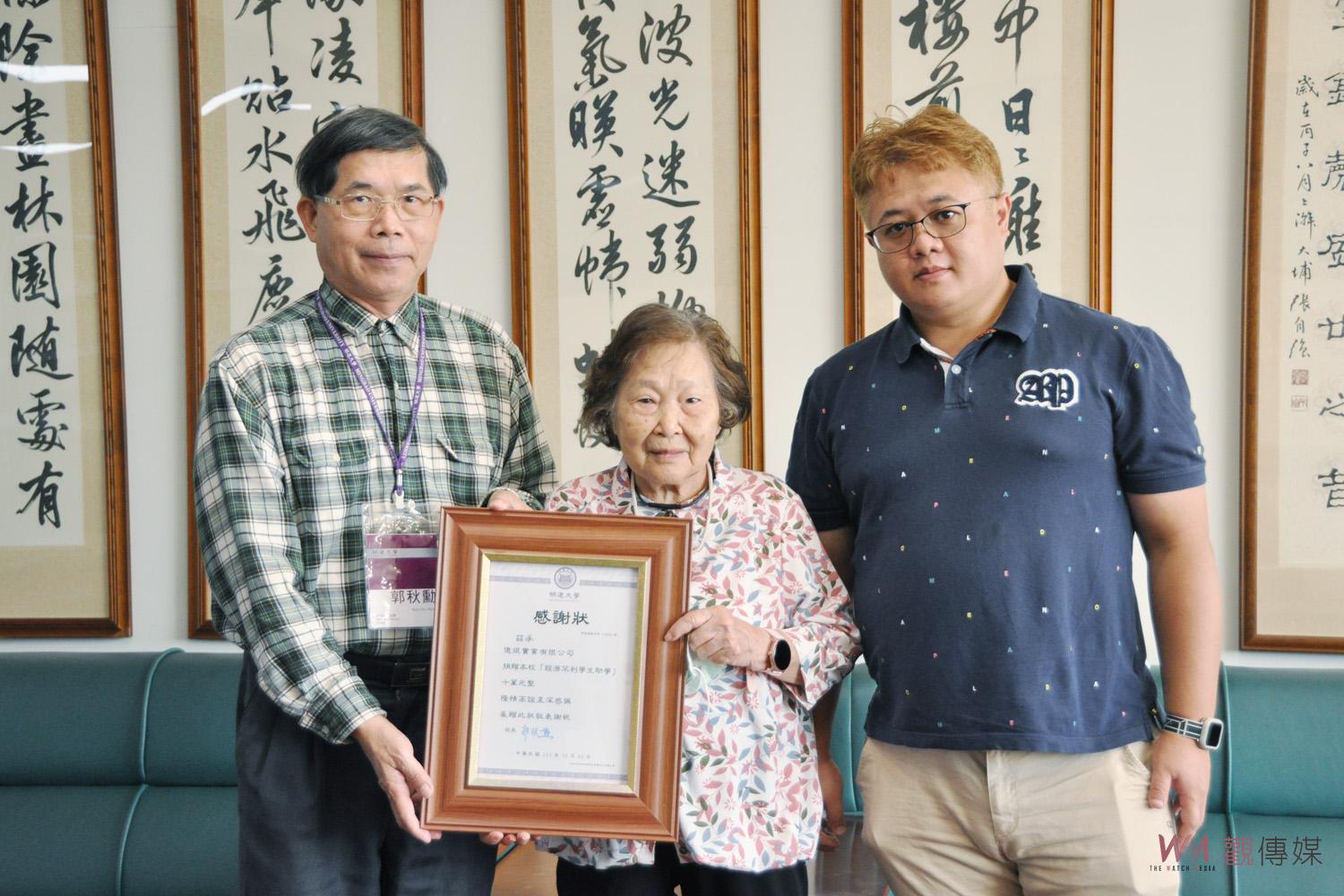 ▲明道大學校長郭秋勳與捐贈者陳伯豪同學及伯豪的祖母一同合影。