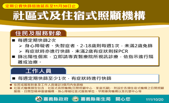嘉義縣也依中央流行疫情指揮中心19日宣布,將各類型住宿式、社區式照顧機構定期公費快篩措施,再延長1個月到11月30日止,篩檢頻率刖維持服務對象每週定期快篩2次(身心障礙者、失智症者、2至18歲則每週1次,未滿2歲免篩),工作人員每週至少1次,有症狀時快篩,曾確診者3個月內免篩檢。