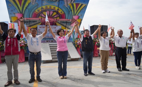 ▲國民黨嘉義縣長候選人王育敏(中)、民雄鄉長候選人林于玲(右)成立聯合競選總部。