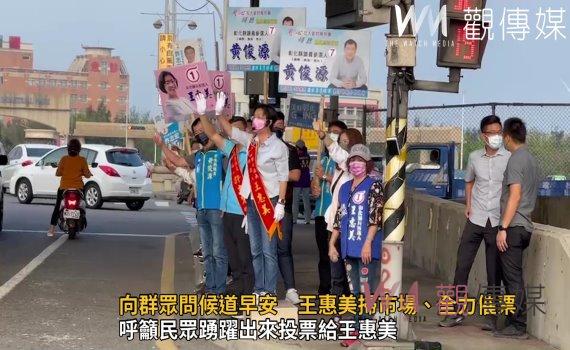 (觀傳媒彰化新聞)【記者陳雅芳/彰化報導】11月26日基層大選進入最後倒數計日,國民黨彰化縣長候選人王惠美,今(22)日一整天都安排拜票行程,大清早先至鹿港早市向市場群眾拜票,接著赴彰濱工業區鹿工路口舉牌站路口,向通勤群眾問候道早安,再偕同鹿港鎮長候選人許志宏、縣議員候選人涂淑媚及黃俊源等人,至鹿港第一市場掃市場拜票。