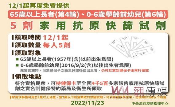 另外針對疫情指揮中心提供免費快篩試劑,0至6歲學齡前幼兒第6輪,65歲以上長者、55歲至64歲原住民第4輪,自12月1日起至桃園市433家健保特約藥局,免費領取每人1份5劑快篩試劑。