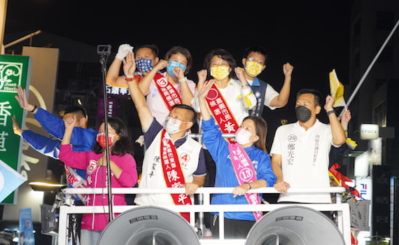 (觀傳媒嘉義新聞)【記者 惲 朋 /嘉義報導】台灣的民主聖地嘉義市,在五合一大選的「選前之夜」的25日晚間,市議員、里長等各隊候選人團隊,繞行中山路噴水圓環一帶沿街拜票造勢,展現民主聖地獨特的選舉文化。雖然市長選舉延到12月18日,但勇媽黃敏惠仍然顧及團隊,發揮母雞帶小雞的精神,以「母雞戰車」陪伴每一位黨籍的候選人站上噴水圓環造勢場。