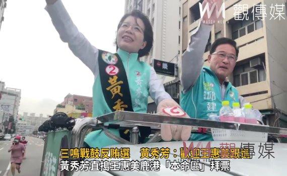 (觀傳媒彰化新聞)【記者陳雅芳/彰化報導】把握選戰最後黃金期,民進黨彰化縣長候選人黃秀芳今(25)日搶攻對手國民黨候選人王惠美的鹿港「本命區」拜票,民眾非常熱情,還有98歲長輩特地出門為黃秀芳加油,讓黃秀芳很感動。