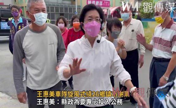 王惠美在發言人張建豐陪同下開始全縣走透透,展開謝票行程,王惠美站在車上,向支持者揮手致意,王惠美感謝鄉親再給她四年,繼續為大家服務。她語帶沙啞地重申軌道工程的重要性,強調軌道工程不只交通,而且是都市再造,產業結合的三合一工程,可以便利交通促進產業發展,提升生活品質。