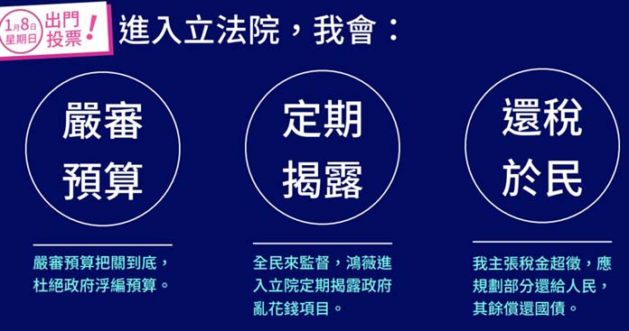 因此王鴻薇提出「還稅於民」,稅金超徵一定要規劃一部分發還給人民,剩下的再拿來還債,不能把錢全部都留給政府亂花。她並強調,未來進入立法院,一定會嚴審預算,杜絕政府浮編,也邀請全民一起來監督,她也會定期公布政府亂花錢的項目,讓全民一起來檢視。