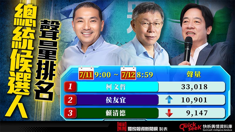 2024總統大選離投票日越來越近,每一個候選人莫不使出渾身解數搏版面。根據QuickseeK 總統大選每日情報總統候選人聲量排名,7/11到7/12的潛在候選人聲量排名柯文哲站上第一名,聲量是33,018,第二名是侯友宜,聲量是10,901(上升1名),第三名是賴清德,聲量是9,147 (下降1名)。