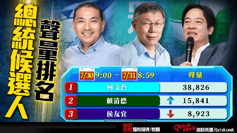 昨(30)日網友討論度最高的仍然是柯文哲,而且光是柯文哲一人的聲量,居然比賴清德和侯友宜加起來都還多,議題王當之無愧。根據QuickseeK 總統大選每日情報總統候選人聲量排名,7/30到7/31的潛在候選人聲量排名柯文哲維持第一名,聲量是38,826,第二名是賴清德,聲量是15,841(上升1),第三名是侯友宜,聲量是8,923(下降1)。