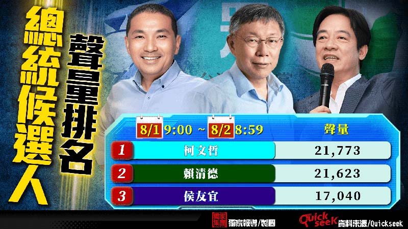 昨(1)日總統候選人的聲量柯文哲和賴清德不分軒輊,賴神一句換誰執政被網友嗆爆,而柯P的玉山蓋捷運,也讓網友驚嚇破表。根據QuickseeK 總統大選每日情報總統候選人聲量排名,8/1到8/2的潛在候選人聲量排名柯文哲維持第一名,聲量是21,773,第二名是賴清德,聲量是21,623,第三名是侯友宜,聲量是17,040。