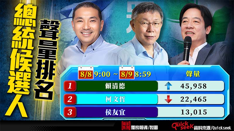 昨(8)日聲量翻盤,賴清德聲量爆量並衝到第一名,光是一則沒有要反攻大陸的新聞討論度就到達10000多筆,可見網友多麼在意啊?根據QuickseeK 總統大選每日情報總統候選人聲量排名,8/8到8/9的潛在候選人聲量排名賴清德躍升到第一名,聲量是45,958(上升1),第二名是柯文哲,聲量是22,465(下降1),第三名是侯友宜,聲量是13,015。
