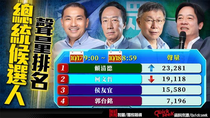 現在的學生不容小覷,一連2天「賴清德喊「未來蓋13萬社宅」學生吐嘈:您市長任內沒落成任何1戶」這條新聞都登上選情熱議的排行榜,昨日更站上第一名,可見咱們國家未來的主人翁可是不容隨意呼嚨的,他們可是非常在意他們未來到底有沒有社宅,。根據QuickseeK 總統大選每日情報總統候選人聲量排名,10/17到10/18的潛在候選人聲量排名賴清德第一名,聲量是23,281 (上升1),第二名是柯文哲,聲量是19,118 (下降1),第三名是侯友宜,聲量是15,580,第四名是郭台銘,聲量是7,196。