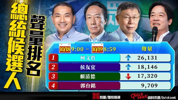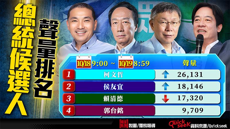 根據 QuickseeK的調查,總統候選人聲量排名柯文哲位居第一名,主要是Ptt的Gossiping在討論「藍白合破局?柯營拒「折衷方案」 侯辦:民眾黨須為無法合作負責」,這個新聞一出,引起網友熱議,討論聲量有3903筆,網友表示「隨便啦!爭老二有必要嗎?」、「黃子哲打臉戴于文耶 好痛好痛」、「侯侯要堅持住 千萬不能妥協」。