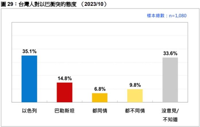 台灣民意基金會問受訪者:「巴勒斯坦和以色列一個禮拜前(10/7)爆發軍事衝突,到目前為止,雙方死傷慘重,衝突持續中。一般說來,您比較同情哪一方?以色列或巴勒斯坦?」結果發現:35.1%以色列,14.8%巴勒斯坦,6.8%都同情,9.8%都不同情,21.6%沒意見,11.9%不知道、拒答。