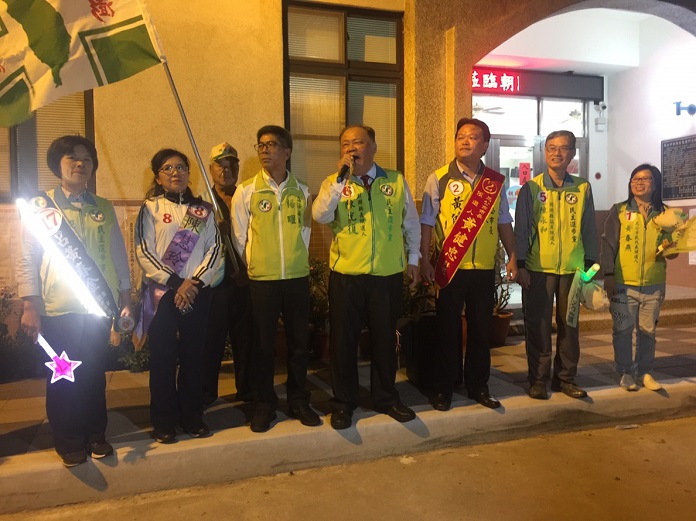 隊伍行經黃健忠競選總部,「凍蒜」聲不絕於耳,待遊街造勢活動結束之際,所有綠營候選人一字排開,進行最後精神喊話和催票,陳光復表示,目前選情膠著,和對手差距僅在3至5百人之間,呼籲大家投票日一定要出來投票,回家要去向大家催票。