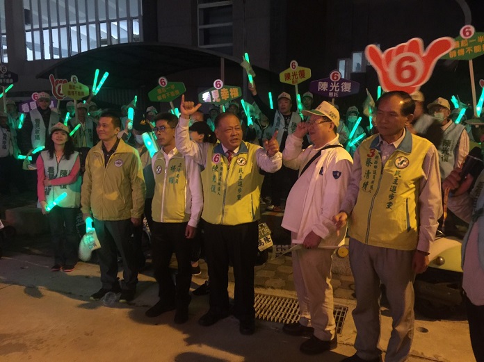 晚上6點半,綠營支持者們開始群聚在朝陽社區活動中心前,陳光復聯袂同陣營立委楊曜現身會場,陳光復滔滔不絕講述自己的政績,並且喊出「幸福在手,不要換手」口號。