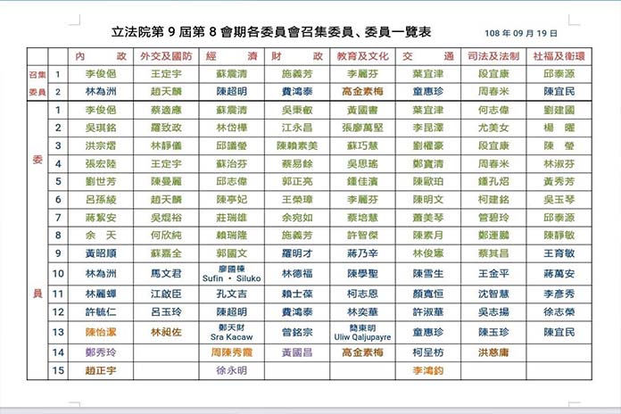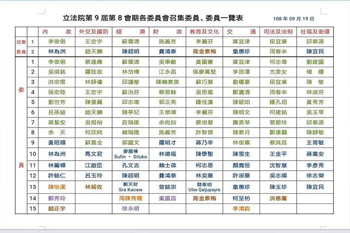立院於9月19日上午舉行第九屆第八會期委員會的召委選舉,8個常設委員會選出2席召委,共有16個名額,依據朝野立委在委員會的分配人數估計,國民黨團在外交及國防、司法及法治委員會人數不足,無法取得召委席次,此2委員會民進黨全拿。