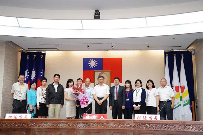 台北市長柯文哲16日上午在市府親自主持新任秘書長交接儀式,他感佩卸任的秘書長張哲揚40年在公務單位辛勞和付出,高度肯定張秘書長過去5年對市府的貢獻,他相信接任的秘書長薛春明必會秉持一絲不苟工作態度,使命必達。