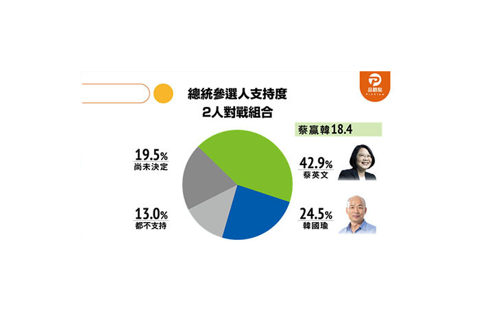 在這樣的國際氛圍催化下,台灣選民轉向支持蔡英文的「護台灣、顧主權」主張。依據《品觀點民調》第19波調查顯示,如果2020總統選舉是藍綠對決情況下,有42.9%選民力挺蔡英文,24.5選民支持韓國瑜,13%都不支持,另外19.5%尚未決定,而蔡英文支持度贏過韓國瑜18.4%,不但差距幅度擴大,兩人的支持度也分別創下新高和新低。