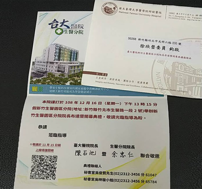 拍板定案後,還有後續臺大醫院規劃設計、員額編列、經費補助、申請建照、公開招標等籌備工作,徐欣瑩都盡全力協助。就是希望讓生醫園區急重症醫學中心,能加速推動。 終於在今(2019)年,12月16日,徐欣瑩終於收到這一張「等了17年」的邀請卡,出席台灣大學生物醫學園區分院的開幕典禮,她表示:「終於對大新竹地區民眾的醫療有所交代了!」