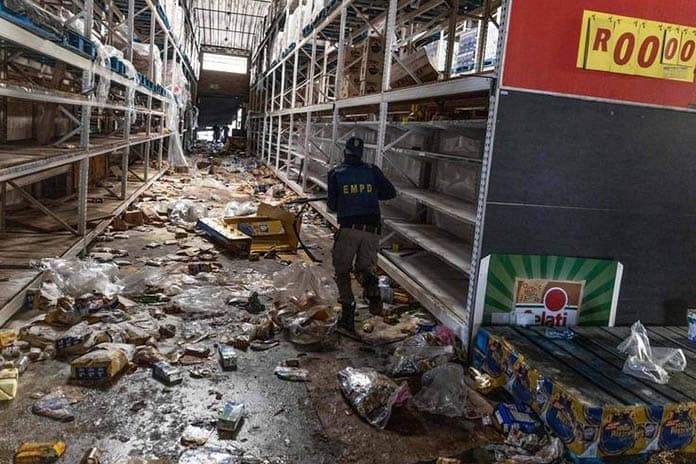 稍早的電視媒體畫面顯示,在蘇威托Soweto,有數以十計男女,甚至兒童進入肉鋪的冷凍庫,扛著沉重的冷凍肉品箱出來,有些婦女還穿著睡袍。警察在3小時後抵達現場,發射橡皮子彈,士兵則在更晚之後才出現。