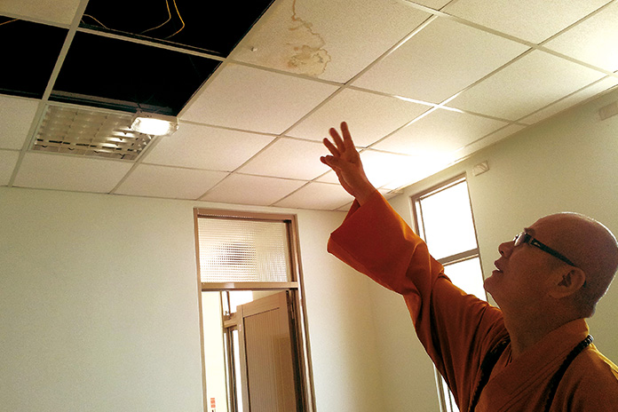 實際走上一趟這棟從2008蓋到2010年底的玄奘紀念館,外觀看起來還算莊嚴樸實,但裡面一樓成了大片積水、逢雨必淹的修行場地了,上到二樓一看,修行者的禪房,幾乎大半都有天花板剝落、嚴重滲漏水的情形,住持傳濟法師指著已經掉落的天花板痛心的說,這樣的工程品質,若看在善男信女的眼裡,我這住持豈不是得下十八層地獄了嗎。