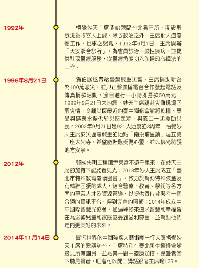 悟覺妙天主席關懷弱勢、默默行善的事蹟,在民間廣為流傳,其所設立的機構都是開立「捐款收據」的基金會,其所得捐款都用來供應基金會運作所需或做社會關懷。但再怎麼努力,這個社會上仍然有宗教力無法關懷的地方,那就是逐漸紊亂的政治環境,人民生活在低薪、失業與「亡國感」的恐怖陰影中,導致更多人生活得非常不快樂,因此妙天主席毅然決然地從感化人心的宗教界、艱辛且備受爭議地走向五濁二世的政壇,就是要給人民過好日子。