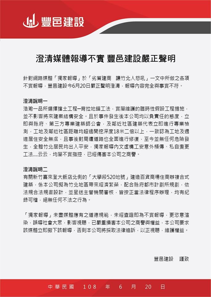 熱門話題特稿專題 針對報導「劣質建商 讓竹北人怒吼」本刊聲明 由 獨家報導 - 2019 年 6 月 21 日 下午 10:06 FacebookTwitterWhatsAppLINECopy URL 針對報導「劣質建商 讓竹北人怒吼」本刊聲明: 1.發掘事實,揭開秘辛,追蹤新聞大事件幕後的真相,這是《獨家報導》一直以來堅持「報真導正、報真導善」的精神。 2. 本刊處理新聞,一向純就事實論述,不只是因為涉及公共安全事務,衍生出的問題,更是全民所重視和關切,故報導周知。 3. 對公眾有益之事,須廣為人知,而對公眾有害之事,媒體更須善盡提醒告知的責任,不因報導之對象而有別。 《獨家報導》編輯部