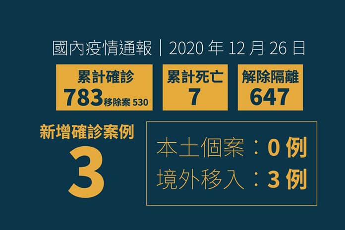 *12月26日公布台灣新增3例境外移入COVID-19武漢肺炎確定病例,分別自菲律賓(案782、783)及印尼(案784)入境。