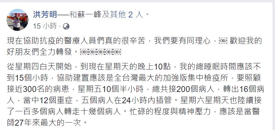 台北市聯合醫院胸腔內科醫師蘇一峰,也於30日轉發洪芳明的文章表示支持此論點,並指出從星期四白天開始,到現在星期天的晚上10點,他自己的總睡眠時間不到15個小時,為的就是要協助建置起應該是全台灣最大的加強版集中檢疫所,要照顧接近300名的病患。洪芳明也表示,自己此時「忙碌的程度與精神壓力,應該是當醫師27年來最大的一次。」