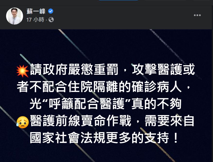 冠肺炎(COVID-19)/武漢肺炎/新型冠狀病毒疫情延燒不斷,昨(31)日在新北市雙和醫院,一名確診了新冠肺炎的62歲洪姓男子,疑似不滿久候,拿出水果刀導致3名女護理師受害,其中1人右手韌帶、神經皆遭砍斷,傷勢嚴重。這名洪姓男子無端傷害醫療人員的惡質行徑引起各界公憤,胸腔科醫師蘇一峰籲政府應當嚴懲。