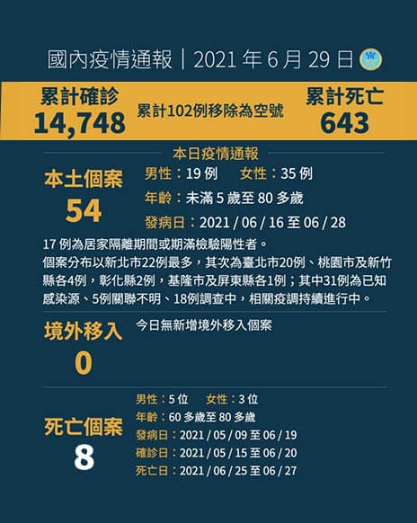 臺灣中央流行疫情指揮中心6月29日公布新增54例COVID-19確定病例,均為本土個案;另確診個案中新增8例死亡。