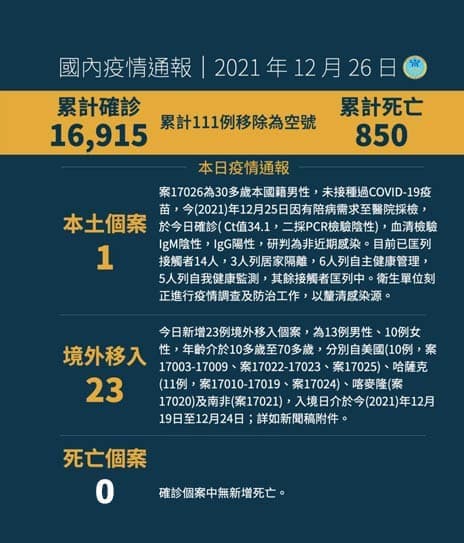 12月26日新增1例本土病例(案17026),為30多歲本國籍男性,未接種過COVID-19疫苗,今2021年12月25日因有陪病需求至醫院採檢,於12月26日確診( Ct值34.1,二採PCR檢驗陰性),血清檢驗IgM陰性,IgG陽性,研判為非近期感染。目前已匡列接觸者14人,3人列居家隔離,6人列自主健康管理,5人列自我健康監測,其餘接觸者匡列中。衛生單位刻正進行疫情調查及防治工作,以釐清感染源。