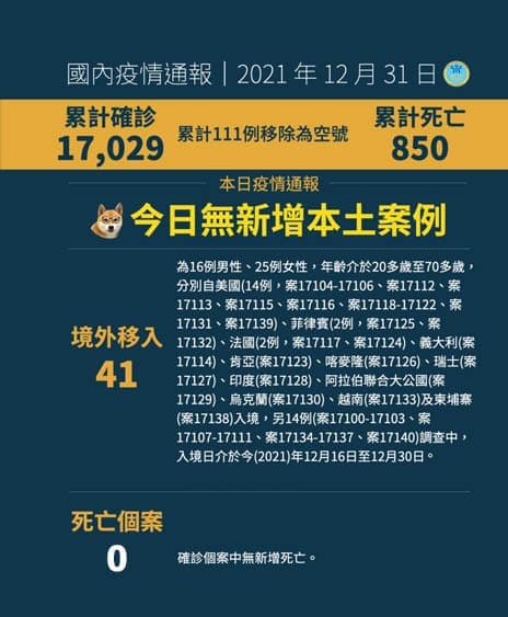 臺灣中央流行疫情指揮中心12月31日公布新增41例COVID-19境外移入確定病例;另確診個案中無新增死亡。